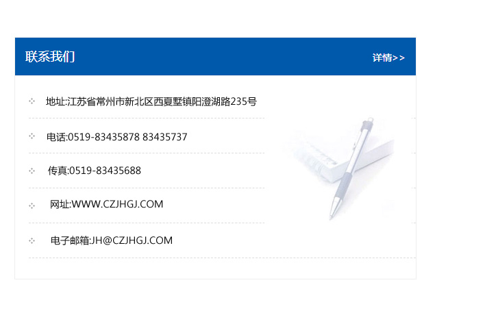 地址:常州市新北區友邦商務大廈1幢16、17層  電話:0519-85101652  傳真:0519-85112595  郵編:213022  網址:www_cz-jiayue_cn.gdebs.com  郵箱:xiajifengaa@163.com